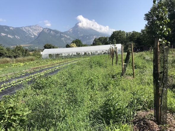 A Saint-Ismier à l’est de Grenoble, une plantation pédagogique en agro-foresterie, autour de productions de petits-fruits et pépinière de fruitier, de vergers, de maraichage attachée au lycée horticole et déjà visitée en 2020.