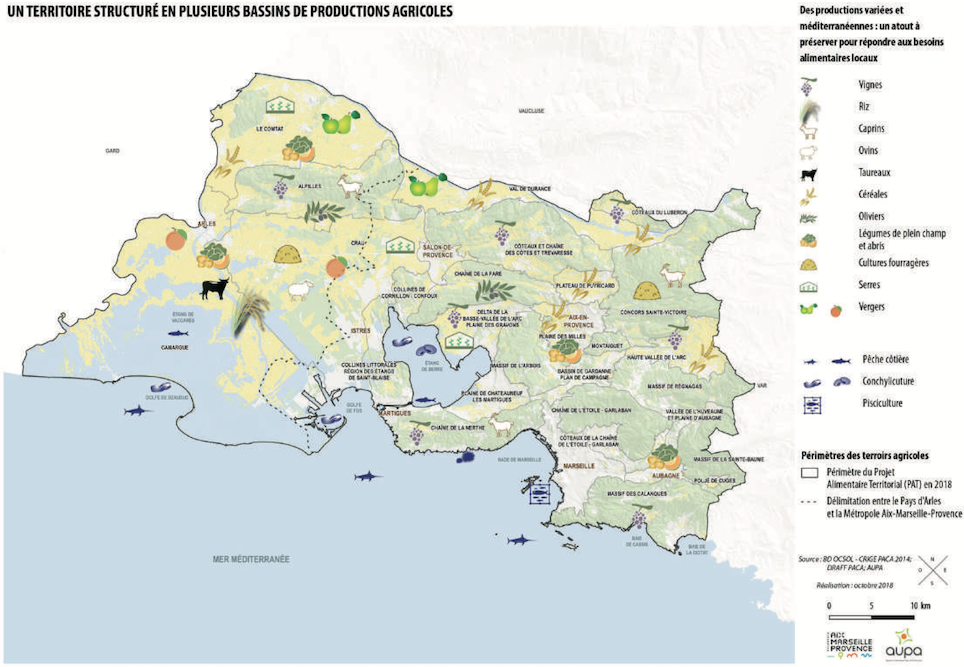 Ce PAT est porté par la Métropole Aix Marseille Provence et le pôle d’équilibre territorial et rural (PTER) du Pays d’Arles. Il comprend l’intégralité du département des Bouches-du-Rhône ainsi que la commune de Saint-Zacharie dans le Var et la commune de Pertuis dans le Vaucluse. C’est le plus grand PAT de France en termes de superficie et de population : 121 communes, plus de 2 millions d’habitants, 5 000 exploitations agricoles, 145 000 ha de terres cultivées. Il a été élaboré de manière concertée avec l’ensemble des acteurs publics et privés. Il es co-piloté par la Métropole Aix-Marseille-Provence et le PETR du Pays d’Arles, en partenariat avec l’État, le Conseil départemental des Bouches-du-Rhône, la Région Sud – Provence-Alpes-Côte d’Azur, la Chambre d’agriculture.