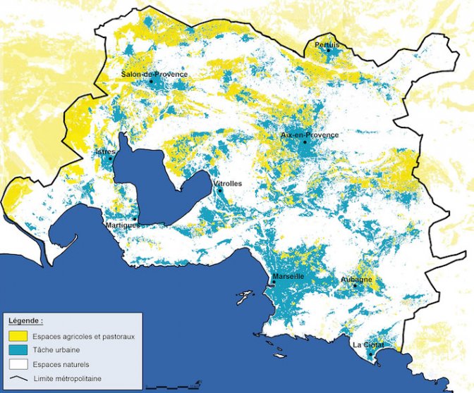 En revanche, ces politiques d’aménagement du territoire sont peu enclines au maintien d’une agriculture par ailleurs déclinante. Le maillage des grands-ensembles périphériques s’est réalisé de manière peu dense sur une matrice naturelle laissant de plus en plus de place à la friche. (Consalès et Millias, 2020). L’agriculture est un non-sujet de l’urbanisme de l’époque. Seuls des combats vindicatifs (poursuivis avec constance sur plus de 30 ans) évitent parfois la marginalisation des activités agricoles. A ce titre, le département des Bouches-du-Rhône est un lieu privilégié d’observation des formes d’agriculture se maintenant dans les interstices de la ville qui se déploie, se déplaçant et se restructurant à sa périphérie, évoluant au grès des contraintes et des opportunités. Nous y reviendrons plus loin.