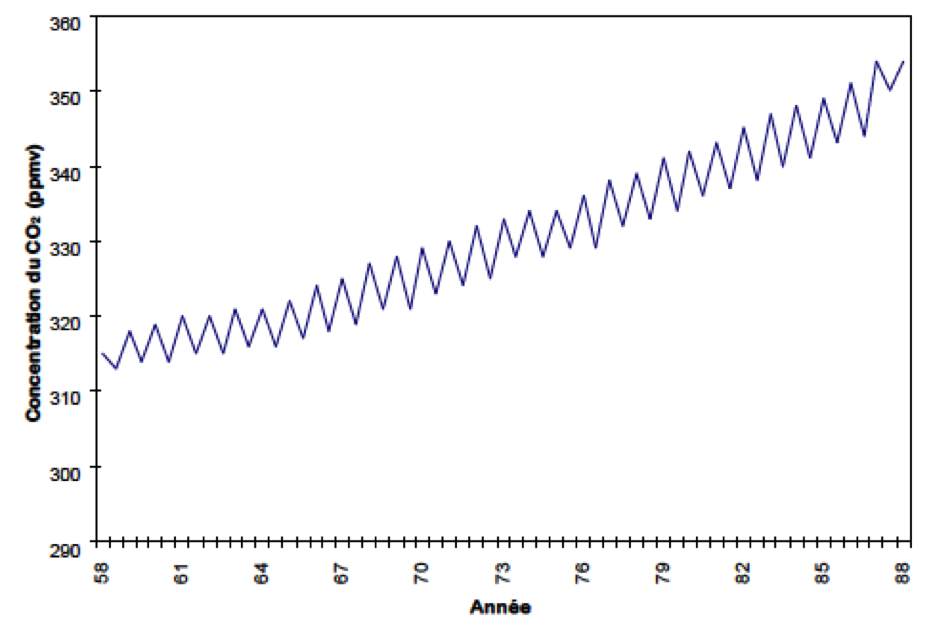 Depuis 1957, la concentration atmosphérique de CO2 fait l’objet d’un suivi précis à l’observatoire de Mauna Loa à Hawaii. L’augmentation graduelle de la concentration atmosphérique de CO2 suit un cycle qui comporte annuellement un maximum et un minimum. Ce cycle annuel est attribuable à l’activité́ saisonnière de la végétation terrestre de l’hémisphère nord, essentiellement les forêts tempérées et boréales de l’hémisphère nord.