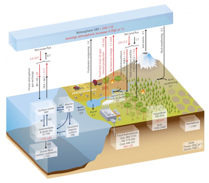 Le GIEC fournit une représentation imagée des échanges de carbone sous forme de dioxyde de carbone dans l’atmosphère et l’océan et des stocks de carbone organique dans la végétation, les sols et les réserves de carbone fossile.