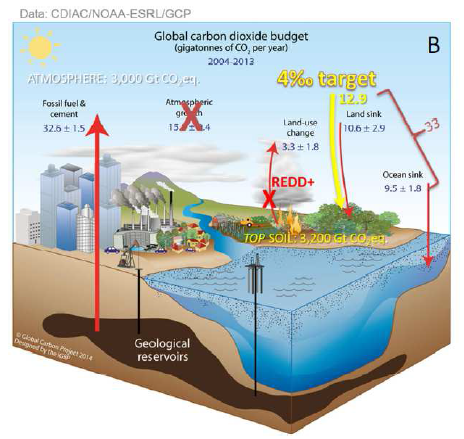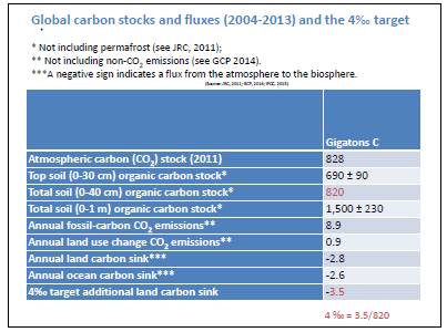 Selon le schéma diffusé par le GIEC [5], le stock de carbone dans les sols au niveau planétaire aujourd’hui est estimé entre 1 500 et 2 400 PgC [6]. En prenant en compte la part considérable de ce carbone stocké dans les 40 premiers centimètres des sols, et les échanges de carbone entre les divers compartiments, l’INRA a ainsi calculé qu’un accroissement de 4‰ de ces stocks suffirait pour absorber les émissions anthropiques de CO2 nettes des puits actuels océanique et de la végétation terrestre. [7]