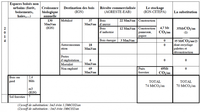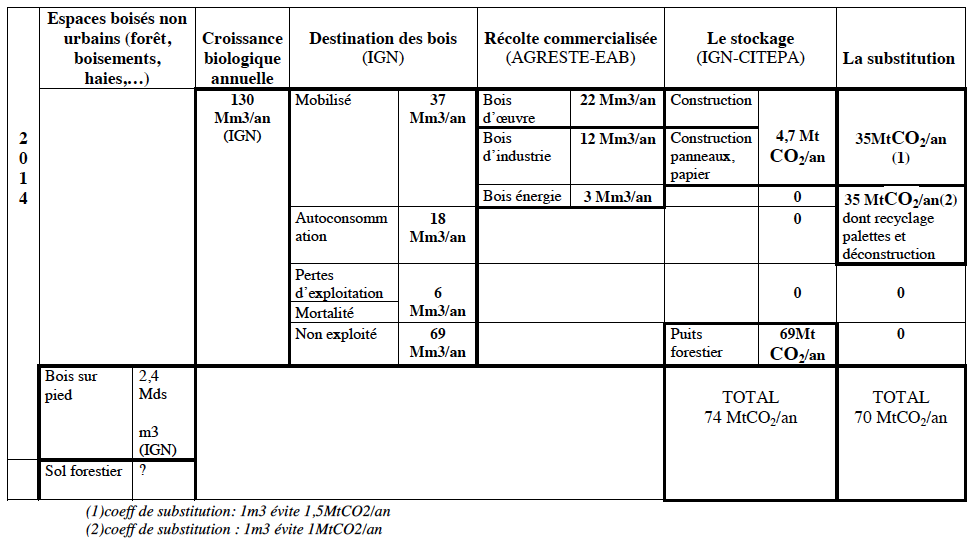 [28] Voir les équivalences plus haut : 1m3 de bois stocke 1/4 de tonne de carbone et séquestre 1 tonnes de CO2.