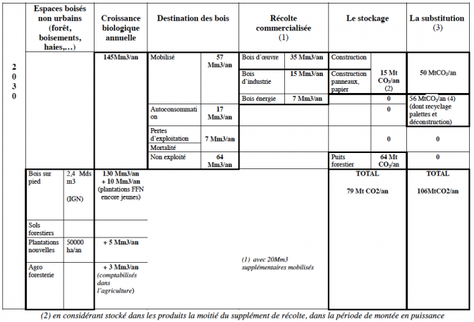 Au final, en 2030, la forêt et les boisements et reboisements créés représenteront une croissance biologique totale de 145 millions de m3 par an soit une capture de 145 MtCO2/an dont 15 MtCO2/an supplémentaires par rapport à aujourd’hui. - Par rapport à 2014, il est prévu : une augmentation de la récolte de + 20 millions de m3 par an, passant de 37 à 57 millions de m3 par an. Compte tenu des évolutions attendues de la croissance biologique forestière, de l’autoconsommation de bois de chauffage, des pertes d’exploitations et de la mobilisation, le volume total du stockage de bois annuel qui resterait en forêt s’élèverait à 64 Mm3/an. Le puits forestier serait donc en 2030 de 64 MtCO2/an, en baisse de 5 MtCO2/an par rapport à 2014.