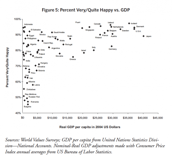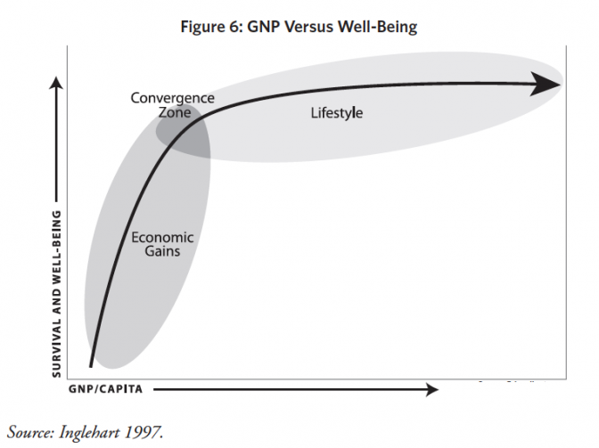L’Organisation de Coopération et de Développement Économique, l’OCDE n’est pas restée à l’écart de ces réflexions. Beyond GDP : The Need for New Measures of Progress expose une vue large de la question. Il montre notamment en graphique que le bonheur ressenti, le bien-être individuel et social, n’est corrélé au PIB que pour de faibles revenus par tête.