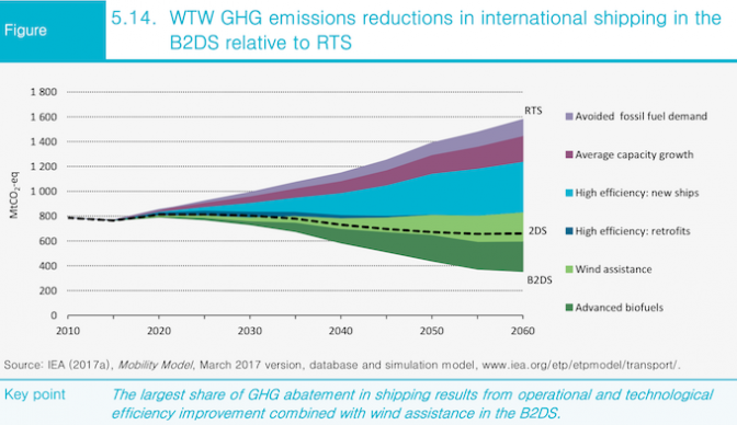 [32] En 2017, l’AIE, a publié un travail visant identifier les technologies disponibles pour répondre à l’objectif de l’Accord de Paris : Energy Technology Perspectives 2017 - Catalysing Energy Technology Transformations. En p. 257-8, avec ce graphique, l’AIE indique que « Le secteur du transport maritime présente un potentiel important d’amélioration de l’efficacité. L’intensité énergétique par navire-kilomètre peut être réduite de près de moitié grâce aux mesures techniques et opérationnelles disponibles aujourd’hui (estimation de l’AIE basée sur Smith et al., 2016). »