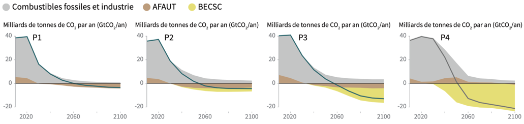 Quatre trajectoires vers +1,5°C modéliséesRéchauffement planétaire de 1,5 °C - Résumé à l’intention des décideurs- une réduction drastique des émissions de CO2 (95% en 2050 et 50% pour les 3 premières dès 2030) ;