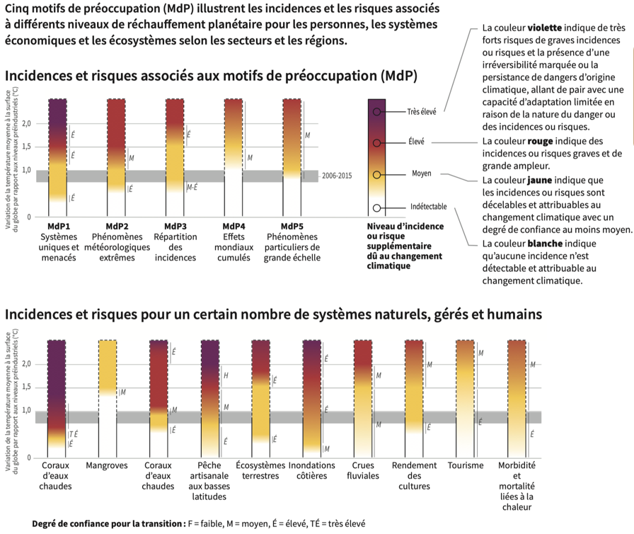 Impacts et risques liés aux niveaux de réchauffementGIEC - SR15 - Figure SPM.2 adapté et traduit par "Citoyens pour le climat"Les incidences et risques s’aggravent sensiblement pour les écosystèmes marins et terrestres, les inondations côtières et les crues fluviales, la pêche et les rendements des cultures, la morbidité et la mortalité liée à la chaleur.