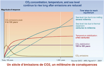 - TAR, 2001, le troisième rapport, a favorisé une sensibilisation élargie du public. Le schéma à gauche illustre les conséquences à très long terme des émissions humaines de GES et l’inertie des systèmes impliqués dans les changements climatiques.
