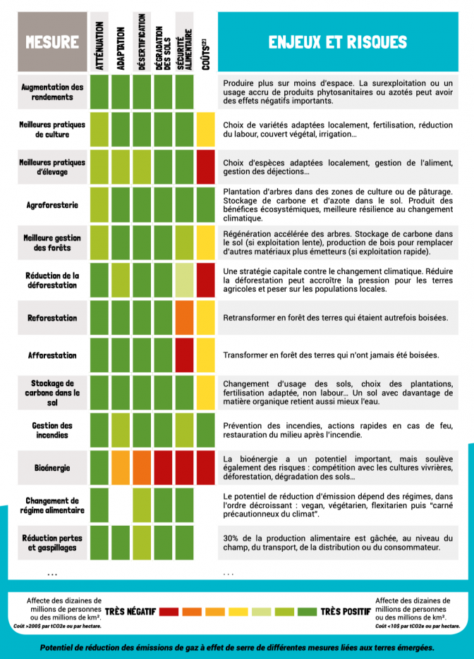 Le rapport SRCCL indique les possibilités et les modes de gestion des terres qui peuvent contribuer à l’adaptation [12] et à l’atténuation [13]. Toutefois, il répète que ces possibilités ne peuvent en aucun cas compenser la poursuite d’émissions excessives de GES. Le déploiement de toutes ces possibilités est conditionné à une forte réduction des émissions de GES de tous les secteurs pour assurer un maintien du réchauffement bien en dessous de 2 °C. L’ONG Citoyens pour le climat illustre de manière synthétique les diverses options d’adaptation et d’atténuation étudiées dans la perspective d’un scénario d’émission RCP1,9 offrant une bonne probabilité d’un réchauffement limité à 1,5°C à la fin du siècle.