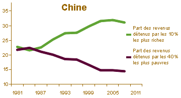 Les inégalités s’aggravent dans la deuxième économie du monde, au point de menacer sa stabilité. [19] Tel était le commentaire dans un article du Figaro de février 2013 qui s’appuyait sur la connaissance récente des évolutions de l’indice de Gini (celui-ci mesure les inégalités de revenu : 0 si égalité parfaite, 1 à l’opposé). L’indice Gini de la Chine se serait élevé à 0,61 en Chine, selon le Centre d’enquête et de recherche sur les revenus des ménages, un institut lié à la banque centrale chinoise. « Ces disparités de revenus sont devenues énormes, commente l’étude de ce think-tank officiel, et un tel coefficient de 0,61 est très rare dans le monde. »