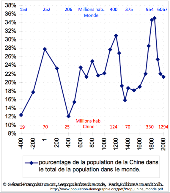 Si la croissance de très long terme de la population chinoise est conforme à celle du monde, en revanche des évolutions très contrastées apparaissent au cours des siècles historiques. Les historiens doivent pouvoir nous apporter des enseignements passionnants. Les XVII et XVIIIe siècles ont vu une forte dynamique de la population chinoise. Elle est passé de moins de 20 % à plus de 35 % de la population mondiale. On comprend la phrase attribuée à Napoléon !