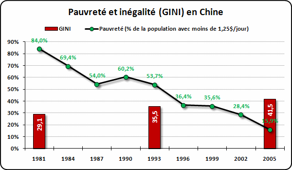 Le Bureau national des statistiques avait depuis publié son propre chiffre, estimant le Gini chinois à 0,474. [...] La société chinoise serait devenue « l’une des plus inégalitaires au monde », [...] le fossé entre riches et pauvres a atteint un niveau « alarmant ». Encore faut-il souligner que ces calculs, notamment venant des services statistiques officiels Chinois, ne prennent pas en compte les revenus provenant de la corruption. On a pu voir depuis que la lutte contre ce fléau est devenu une préoccupation majeure des pouvoirs en place que celle-ci pouvait atteindre des niveaux importants et bénéficier à une strate, certes minoritaire de la population, mais significative [20]. Naturellement ces revenus n’apparaissent pas des les calculs du coefficient de Gini.