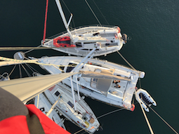 Le lendemain, nous prirent grand plaisir à finir de parcourir le tour de l’ile, ses landes, ses dunes, ses plages quasi-désertes abritant quelques voiliers au mouillage forain. Pour finir, il fallu bien monter au sommet du mât pour reprendre cette drisse de spi qui s’y était malencontreusement nichée.