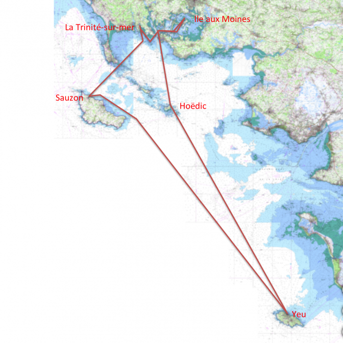 Les Glénans, Groix, Belle-Ile pour sûr, Houat, Le Golfe, Yeu ? Point d’itinéraire a priori, la météo nous aide à choisir. Ce sera :