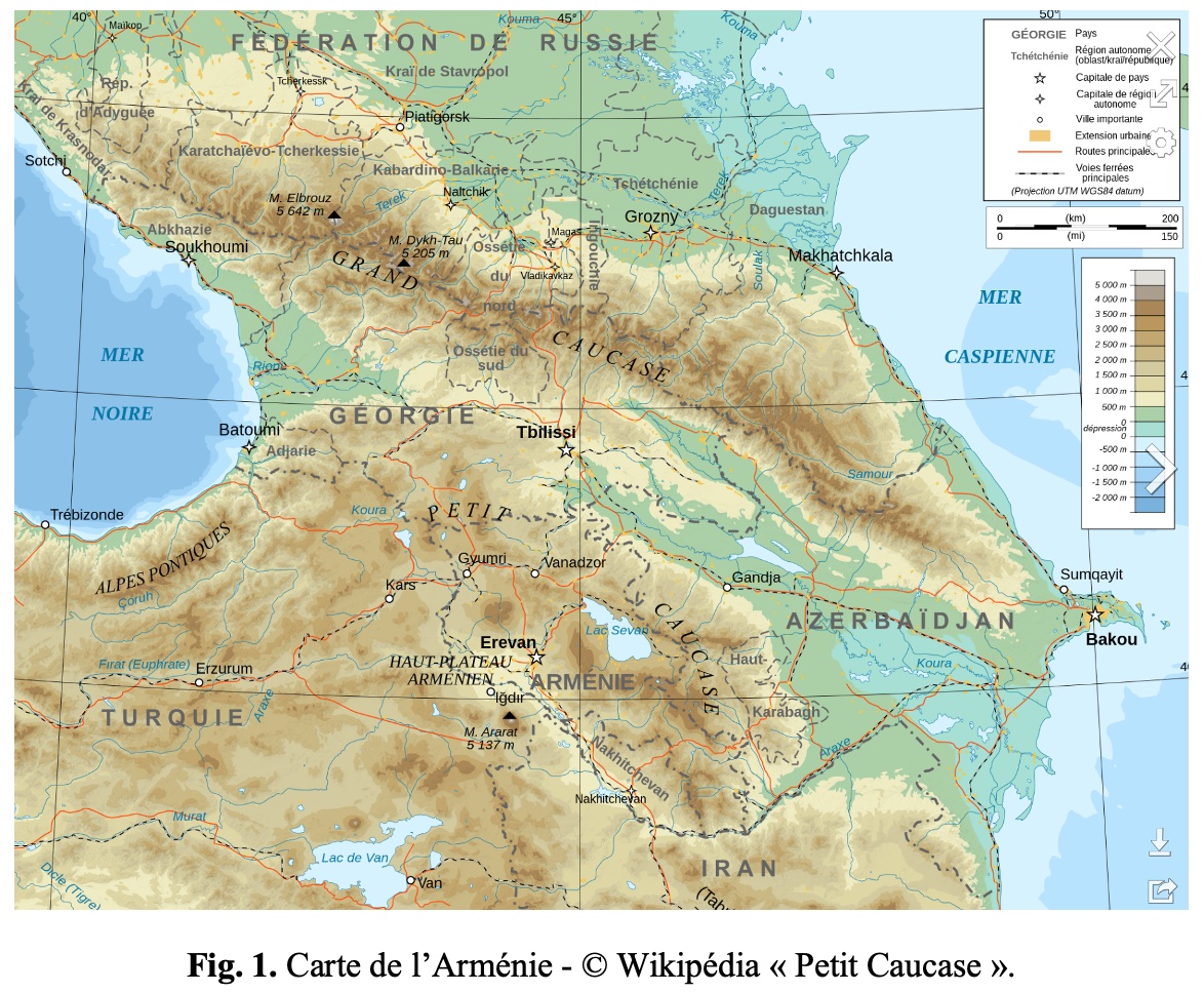 L’Arménie s’étend sur 29 800 km2 (Fig.1). La population totale est de 3 millions d’habitants. Sa géographie se caractérise par sa situation au nord-est du haut-plateau arménien et par ses chaînes montagneuses très élevées. Près de 90 % du territoire se situe à plus de mille mètres d’altitude. Son point culminant historique est le mont Ararat et ses 5 160 mètres jusqu’en 1918 ; depuis, le mont Ararat se trouve en Turquie. Le point culminant actuel est le mont Aragats, 4 090 mètres, dans la région d’Aragatsotn. L’Arménie est située au cœur d’une zone qui connaît une grande activité sismique. Le dernier grand tremblement de terre a fait trente mille morts en 1988.