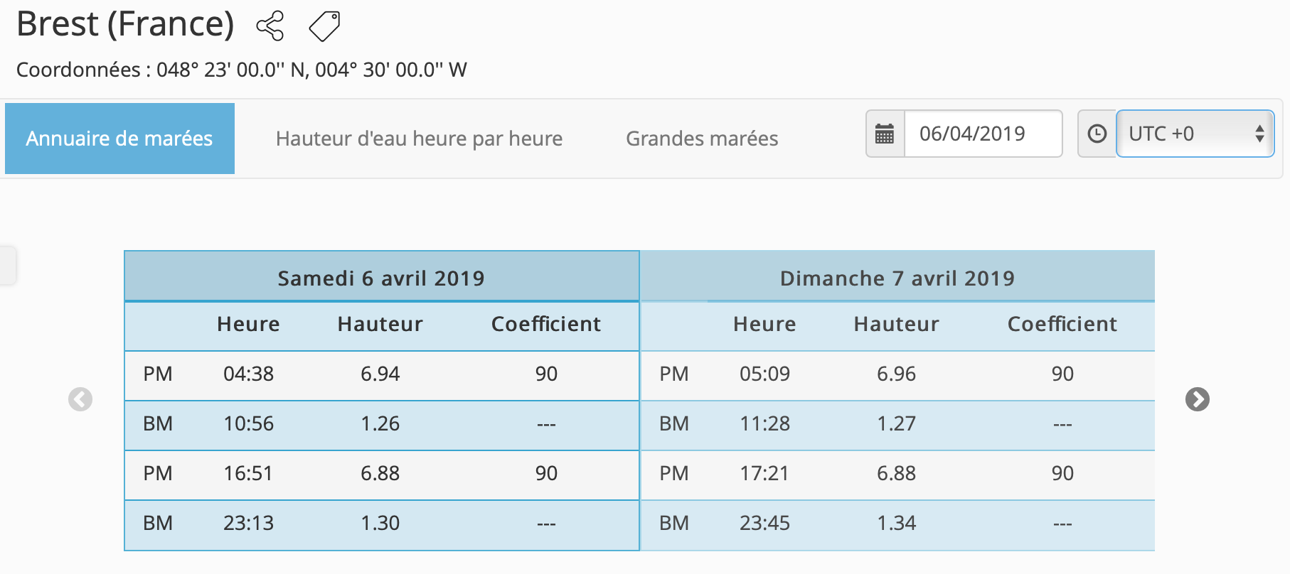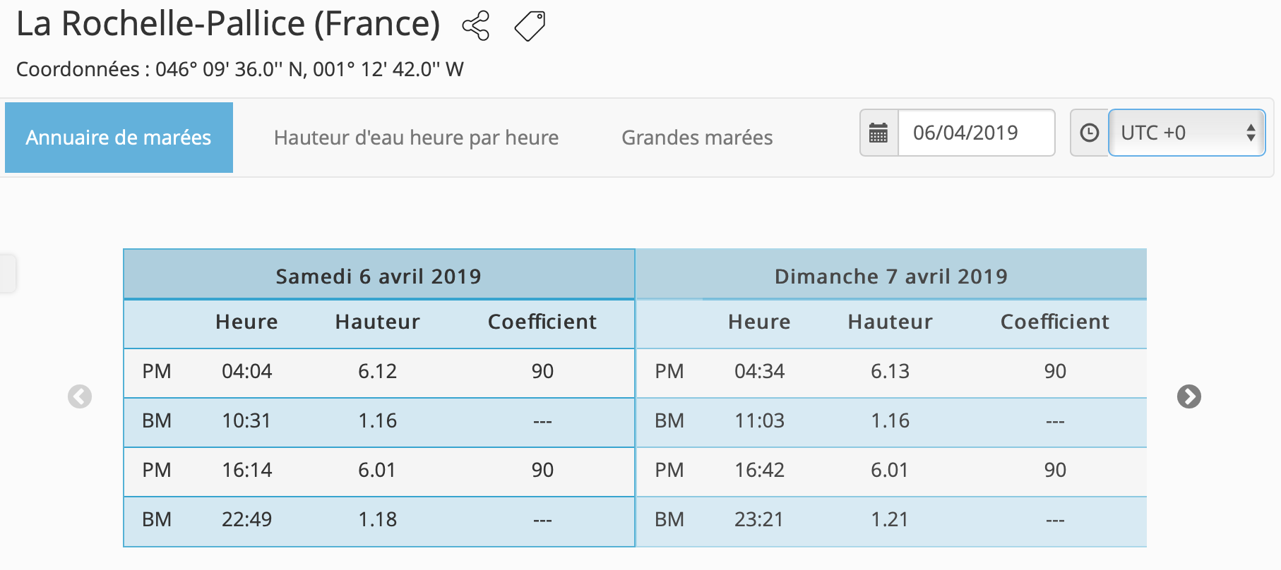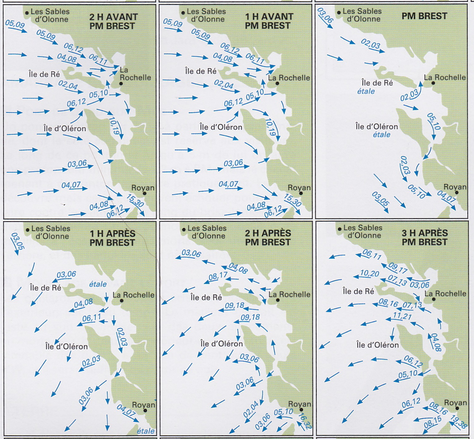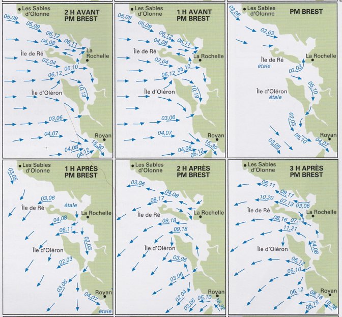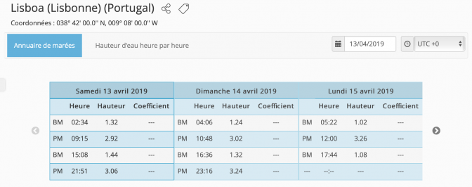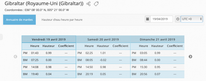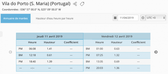 Deux horaire de marée sont utile, celle de Brest qui fait référence pour les courants de marée le long du Golfe de Gascogne et celui de La Rochelle bien sûr pour le départ. Toutes les références horaires ont été prise en temps universel (UTC). Il faut corriger pour le temps locaux.
