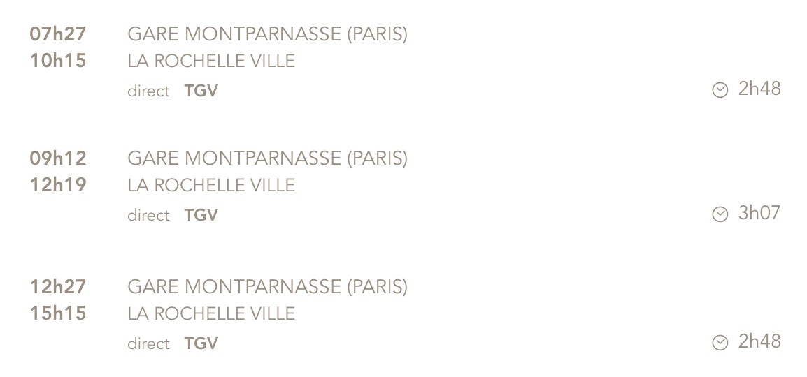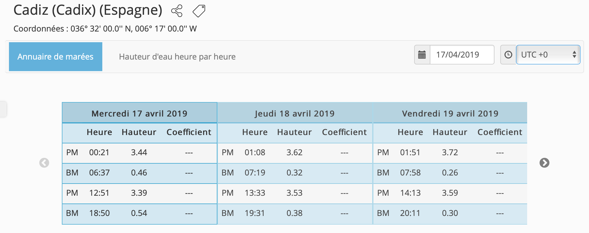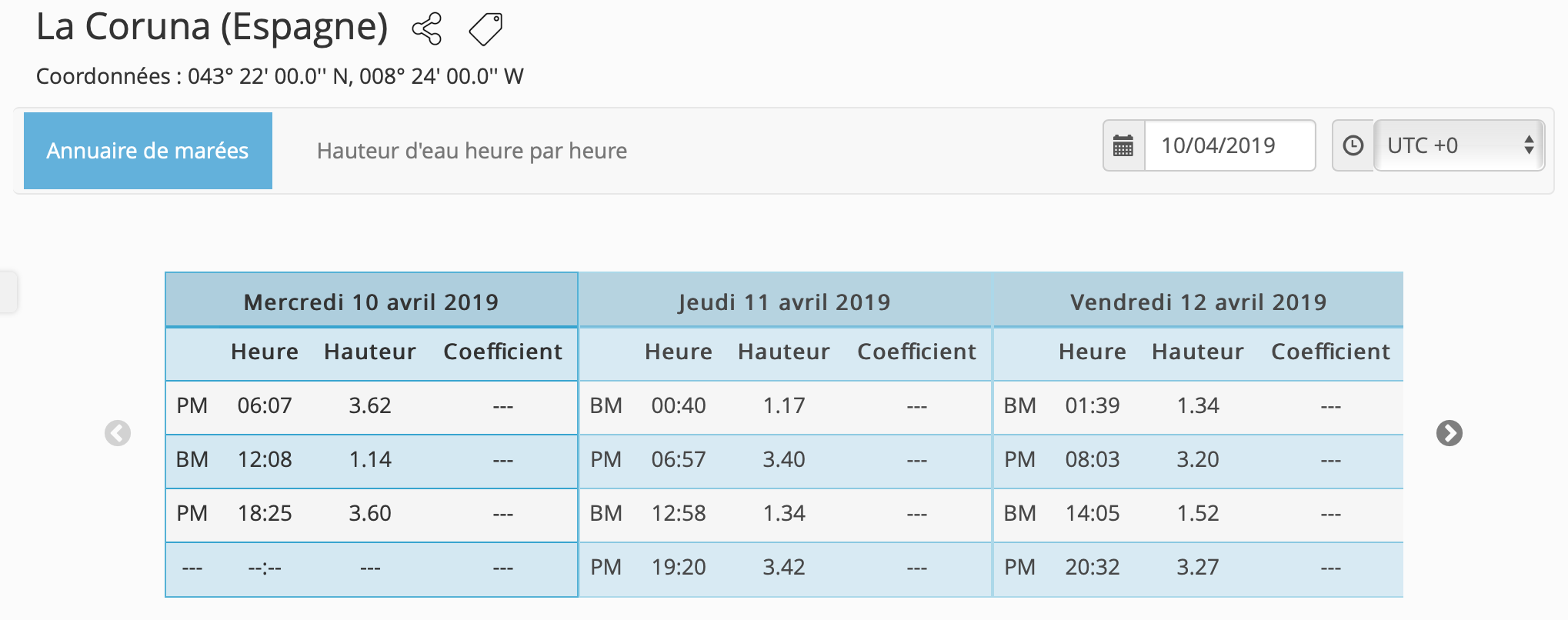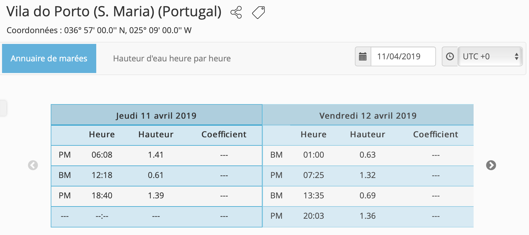 Deux horaire de marée sont utile, celle de Brest qui fait référence pour les courants de marée le long du Golfe de Gascogne et celui de La Rochelle bien sûr pour le départ. Toutes les références horaires ont été prise en temps universel (UTC). Il faut corriger pour le temps locaux.