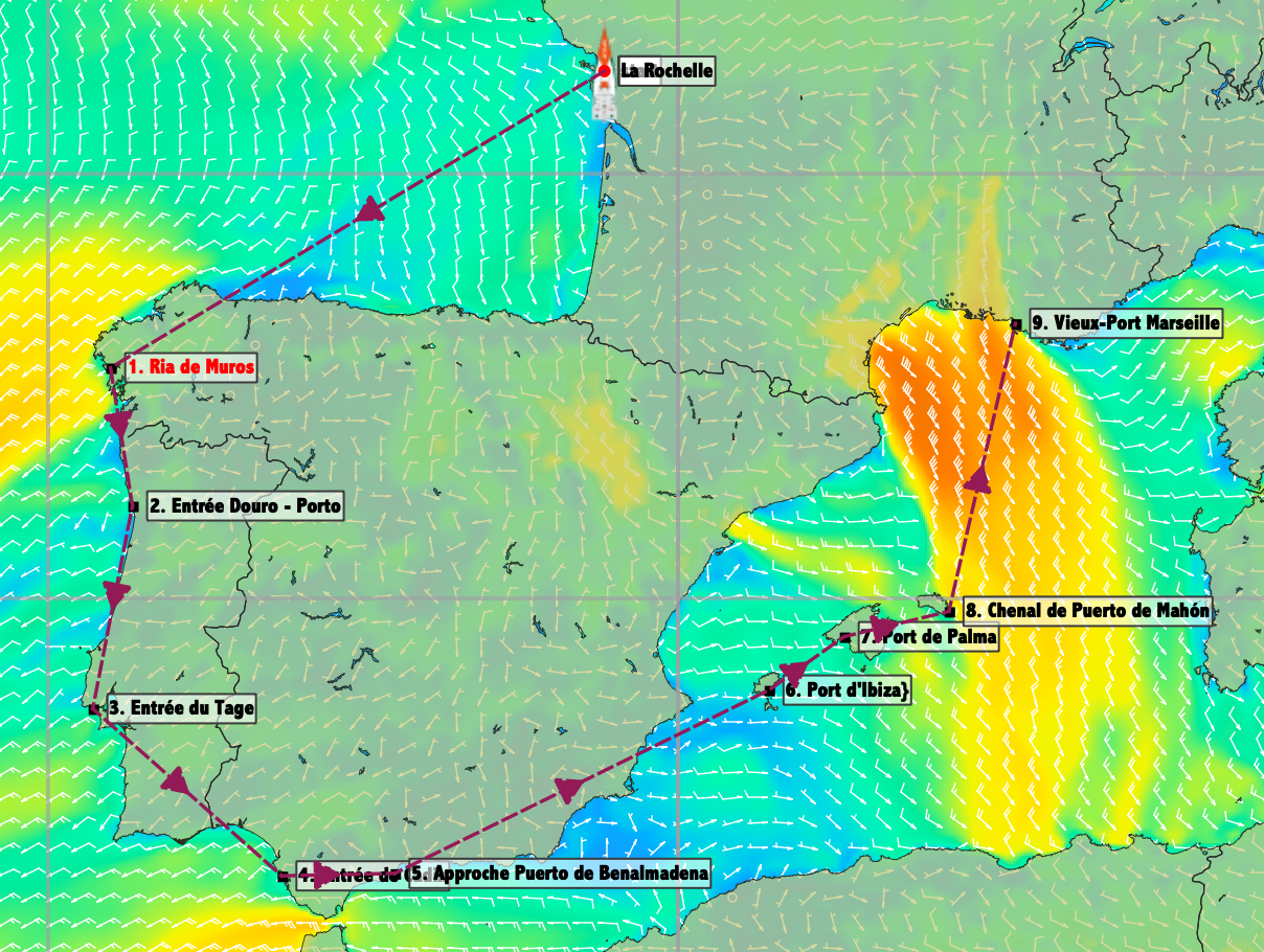 Les points et dates de La Rochelle, Lisbonne, Benalmádena, Ibiza, seront respectés pour permettre les arrivées et départs d’équipiers. Entre ces points, des étapes sont prévues mais non impératives. Elles pourront être échangées pour d’autres et des mouillages forains en fonction du temps et des envies de l’équipage. Les durées ont été calculées avec une vitesse moyenne de 6 nds. Par vents favorables, nous pourrions aller plus vite et permettre d’autres haltes. Mais, la météo peut aussi nous obliger d’avancer au moteur.