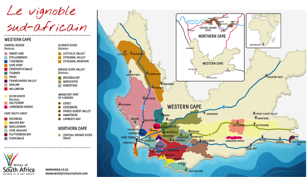 - Régions, 5 grands territoires vinicoles : Coastal Region, Boberg region, Breed River Region, Orange River Region,